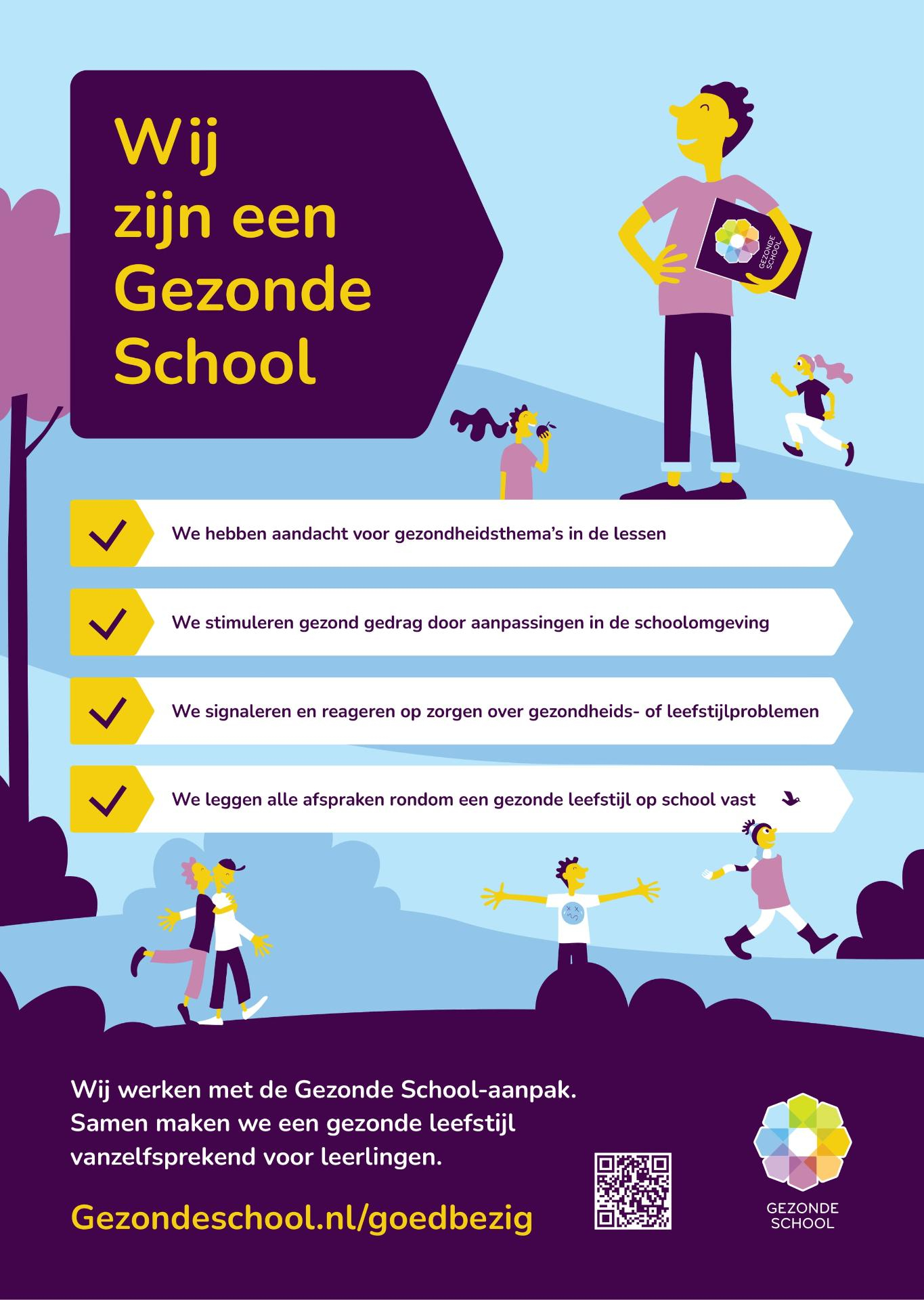 We werken op school aan het vanzelfsprekend maken van een gezonde leefstijl. Want werken aan gezondheid loont. Hiervoor zetten we de Gezonde School-aanpak in. Dit is een integrale aanpak waarmee gezondheid terugkomt in de lesstof, in de schoolomgeving, in signalering en in het beleid. Een échte Gezonde School, als groeiplaats voor een gezonde en vitale samenleving. Met gezonde leerlingen die lekker in hun vel zitten, gezonde keuzes maken en opgroeien tot volwassenen voor wie een gezonde leefstijl vanzelfsprekend is.